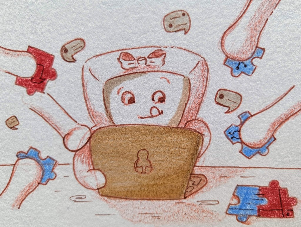 So, here’s the short story behind this sketch – this was inspired by the incredible feeling of support I felt from my amazing colleagues at Automattic. It was my 2nd (and last) week of support rotation as a new hire and I spent most of it answering to questions that users of WordPress.com had.