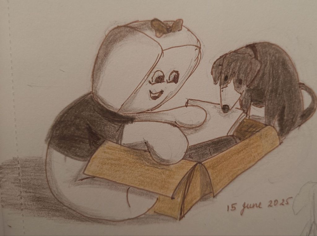 When I started at Automattic I bought myself a mystery bag of art supplies from Erchr as a little gift to myself. It took about three weeks to arrive and when it finally did, I was over the moon! This sketch is yet another wonky one illustrating the pure excitement I felt as I ripped open the package and threw around the bubble wraps to unveil my surprise.