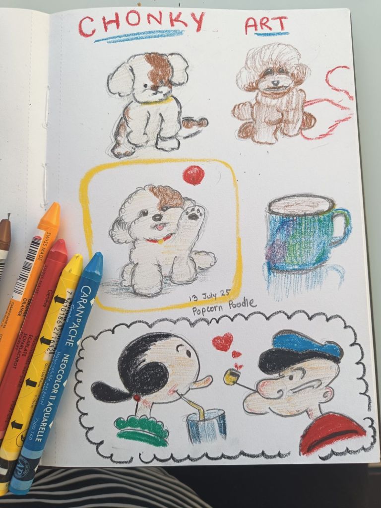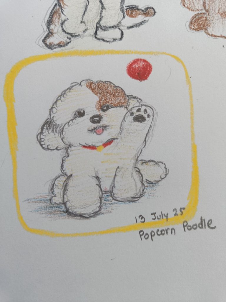 The poodle on the top left was my first attempt at drawing the dog that looked like the popcorn. It was okay. Then I decided to do a quick study of a poodle from Pinterest. That’s the one on top right. After that I was ready enough to draw the final popcorn poodle.