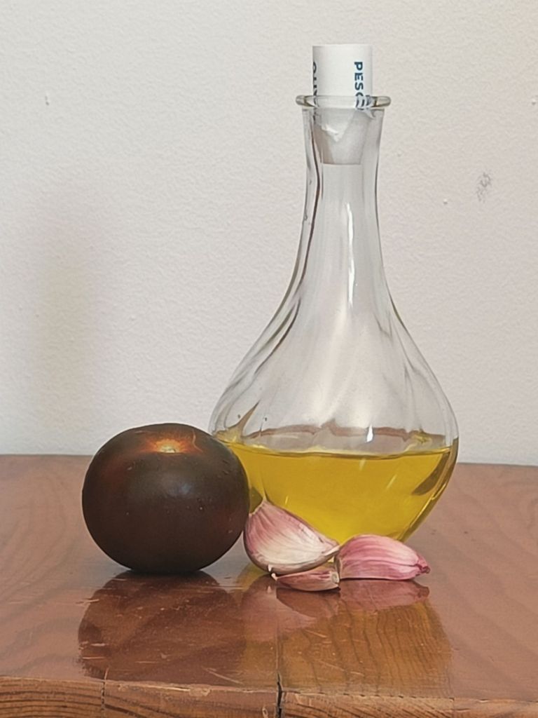 On to the next thing. I did a little still life study in gouache today. I think the biggest lesson I’ve learned from the aforementioned course on painting with light and color is just how important it is to paint from life. I set up nearly all the ingredients of my favorite Spanish dish – pan con tomate (minus the bread) in a somewhat diffused/non-direct lighting.
