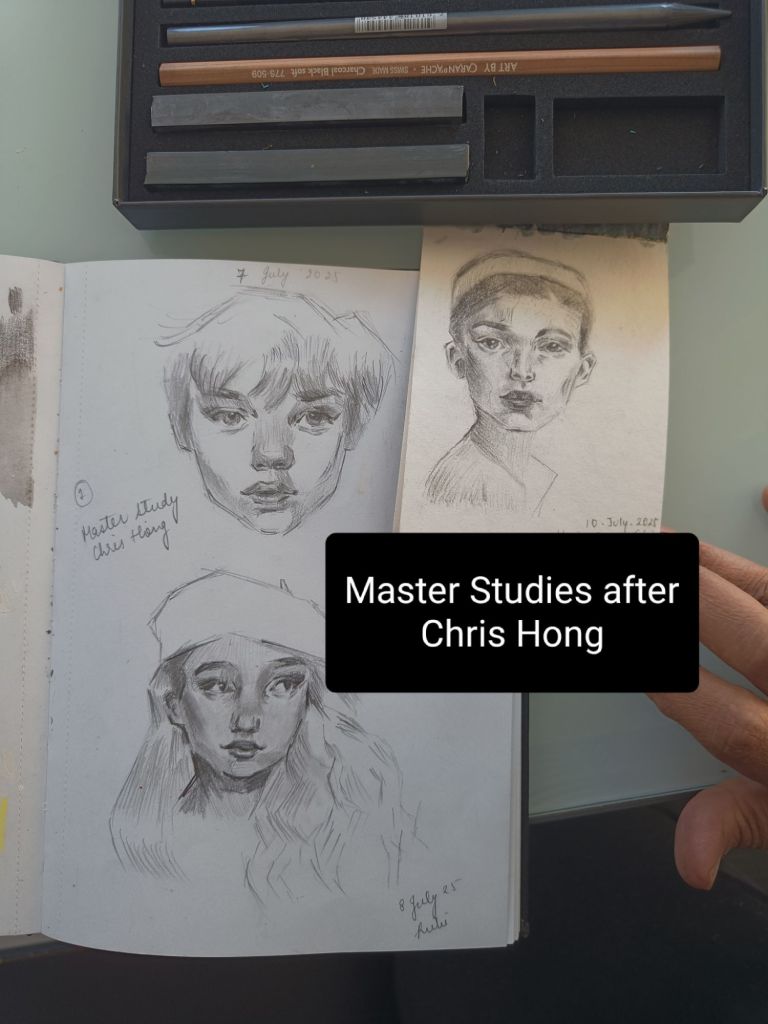 Much like most artists and aspiring artists around my age, I adore Chris’ work. I especially love her portraits. My favorite thing about them is how much of the form and emotion she is able to communicate without over-crowding her work. It’s something I really do struggle with (as will be evident in the coming up portraits). I have taken 3 of her courses on Skillshare and I plan on taking her watercolor course when I’m back in Switzerland (where my watercolors are 😁).